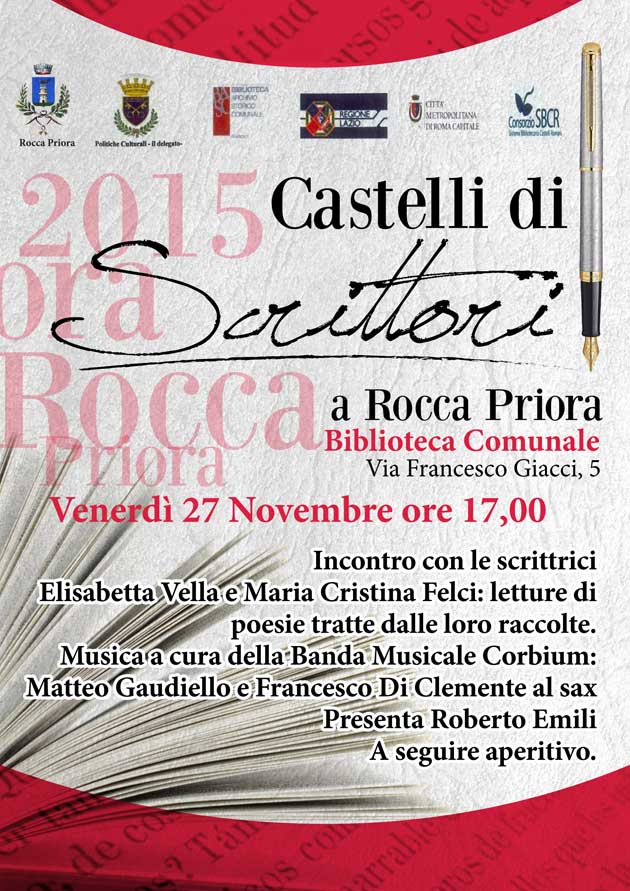 (<• click sulla locandina per ingrandirla) Rocca Priora, ospiterà il terzo incontro di “Castelli di Scrittori”, Venerdì 27 Novembre 2015, alle ore 17.00, nella Biblioteca comunale “Luigi Porcari”, situata in Via Mons. Giacci 2.