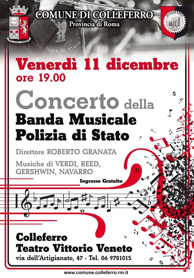 COLLEFERRO (RM) – Oggi, Venerdì 11 Dicembre alle ore 19, il Teatro Vittorio Veneto, in Via dell’Artigianato 47, ospiterà il concerto della Banda della Polizia di Stato, diretto dal Maestro Roberto Granata.