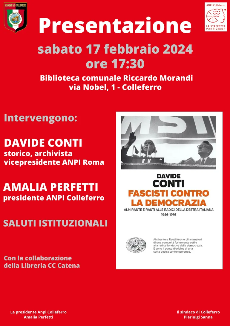 Sabato 17 Febbraio alle 17.30, presso la Biblioteca Comunale R. Morandi, Davide Conti presenterà il suo saggio storico, “Fascisti contro la democrazia. Almirante e Rauti alle radici della destra italiana 1946-1976”.