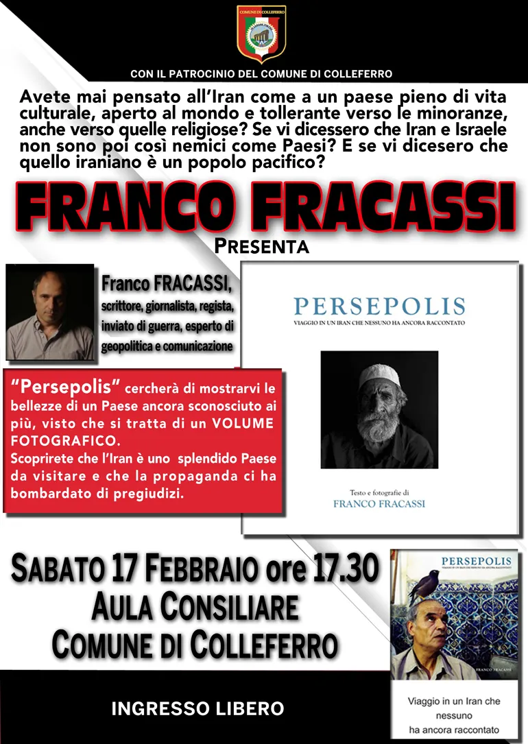 Sabato 17 Febbraio alle ore 17.30, presso l’Aula Consiliare del Comune di Colleferro, appuntamento con il giornalista Franco Fracassi che presenterà “Persepolis”.