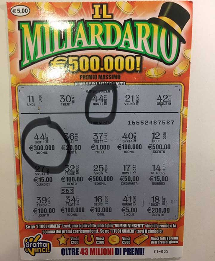 La vincita è stata conseguita con un semplice biglietto “Gratta e Vinci” da 5€ per la coincidenza del numero 44 tra i numeri vincenti.