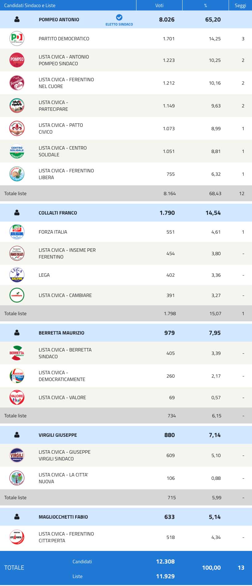 Il Sindaco uscente Antonio Pompeo (supportato da ben 7 liste: Partito Democratico, Antonio Pompeo Sindaco, Ferentino Nel Cuore, Partecipare Patto Civico, Centro Solidale, Ferentino Libera) ha infatti ottenuto 8.026 voti, il 65,20%.