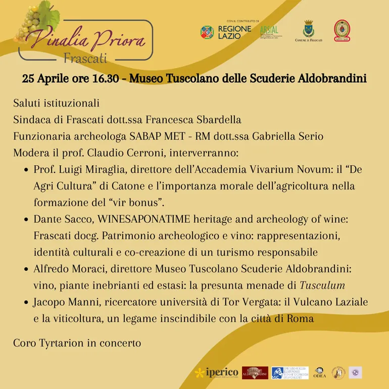 La manifestazione, ispirata alle antiche festività romane celebrate in aprile in onore del raccolto d’uva dell’anno precedente, vuole rinnovare oggi il millenario legame esistente tra il vino e il territorio tuscolano.