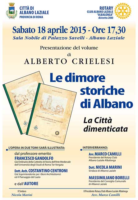 ALBANO LAZIALE (RM) – Nella Sala Nobile di Palazzo Savelli, in Albano Laziale, Sabato 18 Aprile 2015, alle ore 17.30, verrà presentata l’opera dello storico, Alberto Crielesi: “Le dimore storiche di Albano – La Città dimenticata”, in due tomi, frutto di oltre cinque anni di ricerche presso gli Archivi più importanti dei Nobili del luogo, italiani e vaticani.