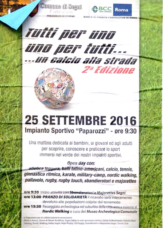 SEGNI (RM) – Torna domani, Domenica 25 Settembre, la grande giornata di Sport ai campi sportivi di Segni “Tutti per uno, uno per tutti… Un calcio alla strada”.