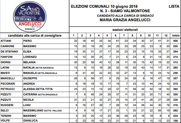 Maria Grazia Angelucci (Candidato Sindaco non eletto), Piero Attiani 406, Alessia Petrucci Detta Titta 365, Caterina Pizzuti Detta Spagnolo 350, della Lista “Siamo Valmontone”.