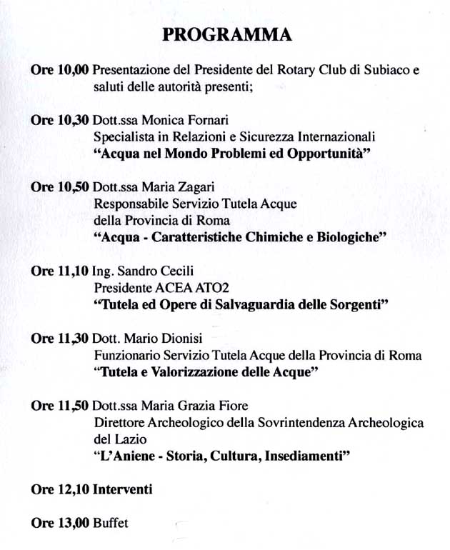 SUBIACO (RM) – Nell’ambito delle sue attività statutarie, il Rotary Club di Subiaco, nell’Anno Rotariano 2013/2014, ha programmato un’importante manifestazione per richiamare l’attenzione delle istituzioni e delle popolazioni della Valle dell’Aniene sul tema dell’acqua come risorsa da salvaguardare e valorizzare.