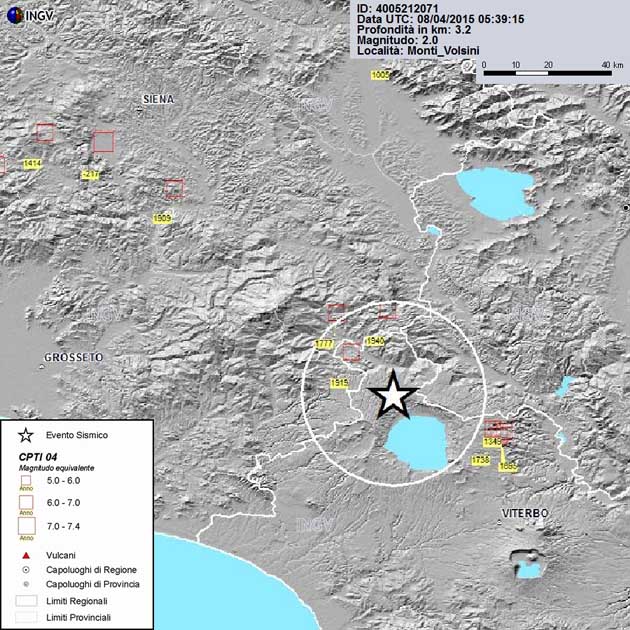 UN TERREMOTO di magnitudo 2 è avvenuto alle ore 07:39:15 italiane di oggi 8 Aprile 2015, nel viterbese nell’area a Nord-Nord-Ovest del Lago di Bolsena, interessando anche la parte più meridionale della Provincia di Grosseto. Non si sono registrati danni a Persone o cose.