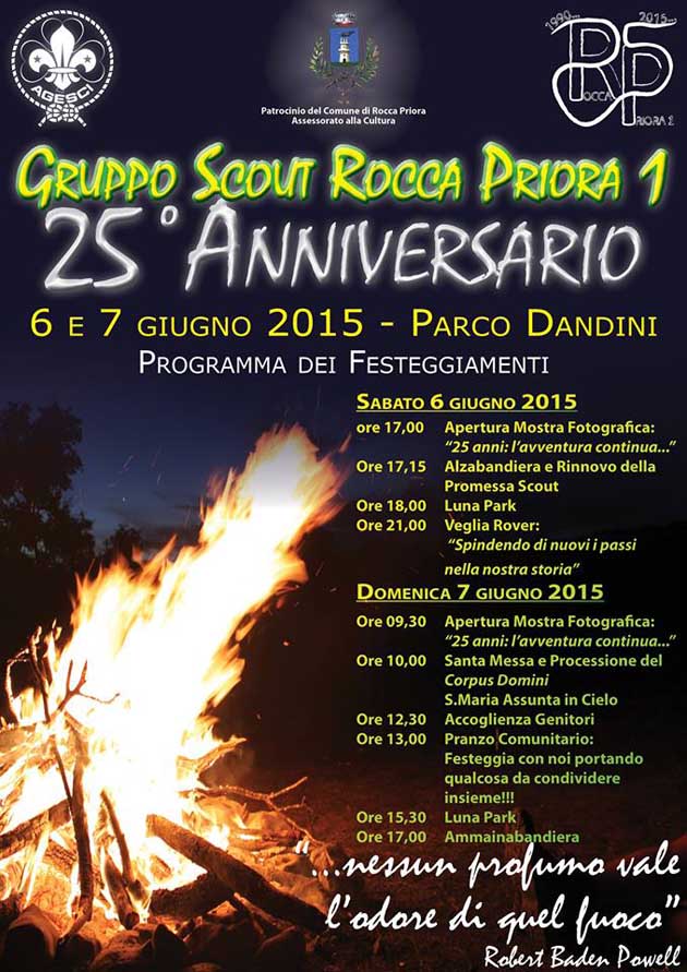 ROCCA PRIORA (RM) – Oggi, Sabato 6 e domani, Domenica 7 Giugno 2015, nel Parco Dandini di Rocca Priora, il “Gruppo Scout Rocca Priora 1”, con il patrocinio dl Comune e dell’Assessorato alla Cultura, festeggerà il 25° Anniversario della Fondazione.