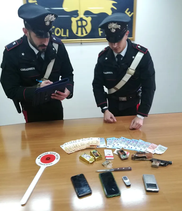 In casa hanno trovato quasi 350 grammi di hashish suddivisa in varie dosi pronte per lo spaccio, materiale atto al confezionamento, un bilancino di precisione, un coltello ed una pistola lancia razzi. Oltre allo stupefacente è stata sequestrata la somma di 1300 euro divisa in banconote di vario taglio, ritenuta provento dell’attività di spaccio.
