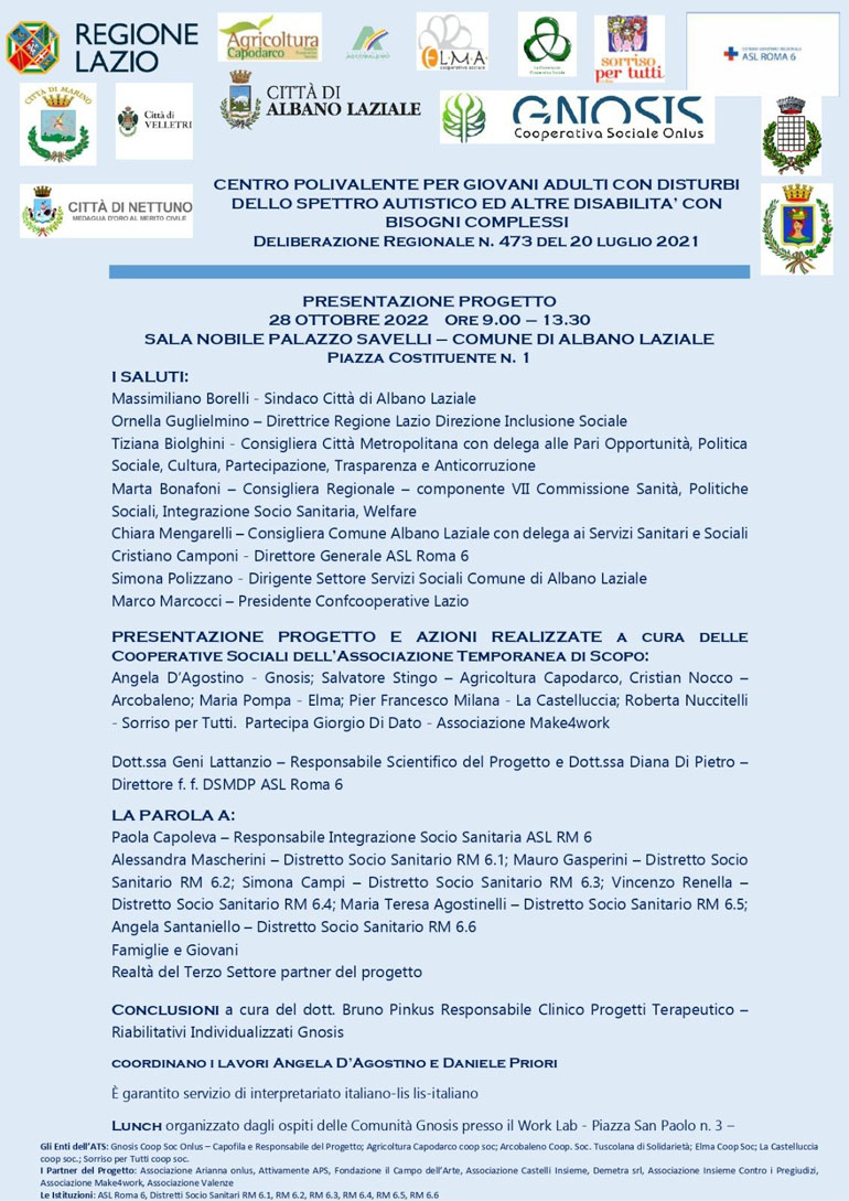 Le attività del nuovo Centro che, come si come si legge nella deliberazione approvata lo scorso anno dalla Regione Lazio (N. 473 del 20 Luglio 2021) intende realizzare un autentico “cambio di paradigma con percorsi innovativi e partecipati di inclusione sociale della disabilità in età adulta”, saranno coordinate dalla Cooperativa Sociale Gnosis, responsabile del progetto e capofila della rete di cooperative sociali del territorio costituitasi in associazione temporanea di scopo (ATS) insieme ad altre cinque (Agricoltura Capodarco, Arcobaleno, Elma, La Castelluccia e Sorriso per Tutti).
