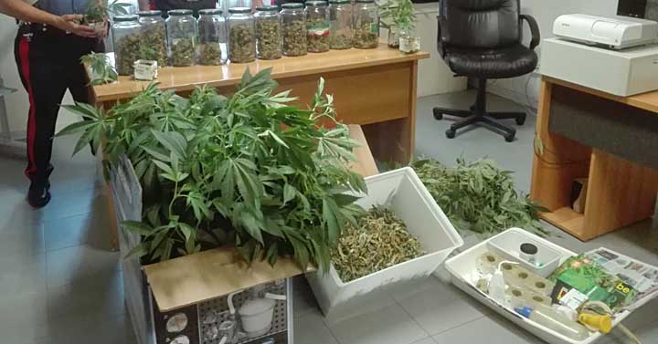 Successivamente estendevano la perquisizione anche presso la sua abitazione, laddove rinvenivano nella dependance un’ampia serra completa di impianto di irrigazione, essiccazione e aerazione di circa 20 mq. predisposta per la coltivazione con all’interno 45 piante di “marjuana” (altezza m.1,20) del peso complessivo 14kg e 1,09Kg di marjuana già essiccata, oltre a copioso materiale utilizzato per il confezionamento della sostanza stupefacente.
