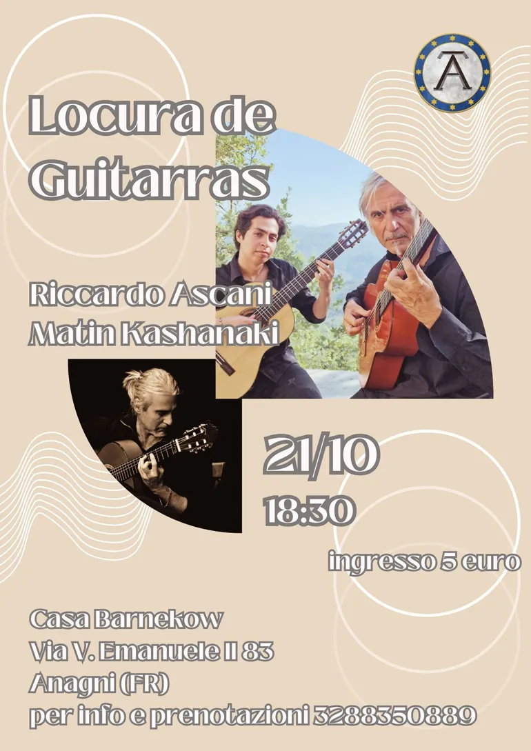 ANAGNI (Eledina Lorenzon) – Sabato, 21 Ottobre, Casa Barnekow – Anagni CittàInArte ospiterà il Musicista Riccardo Ascani per la presentazione del suo progetto “Locura de Guitarras Duo”, con Matin Kashanaki.