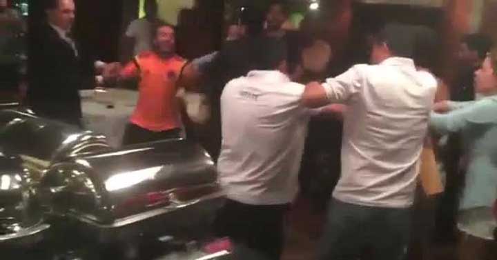 Si scatena la rissa e i fomentatori ne approfittano per svignarsela senza pagare il conto ma non prima di essersi fatti consegnare la torta…