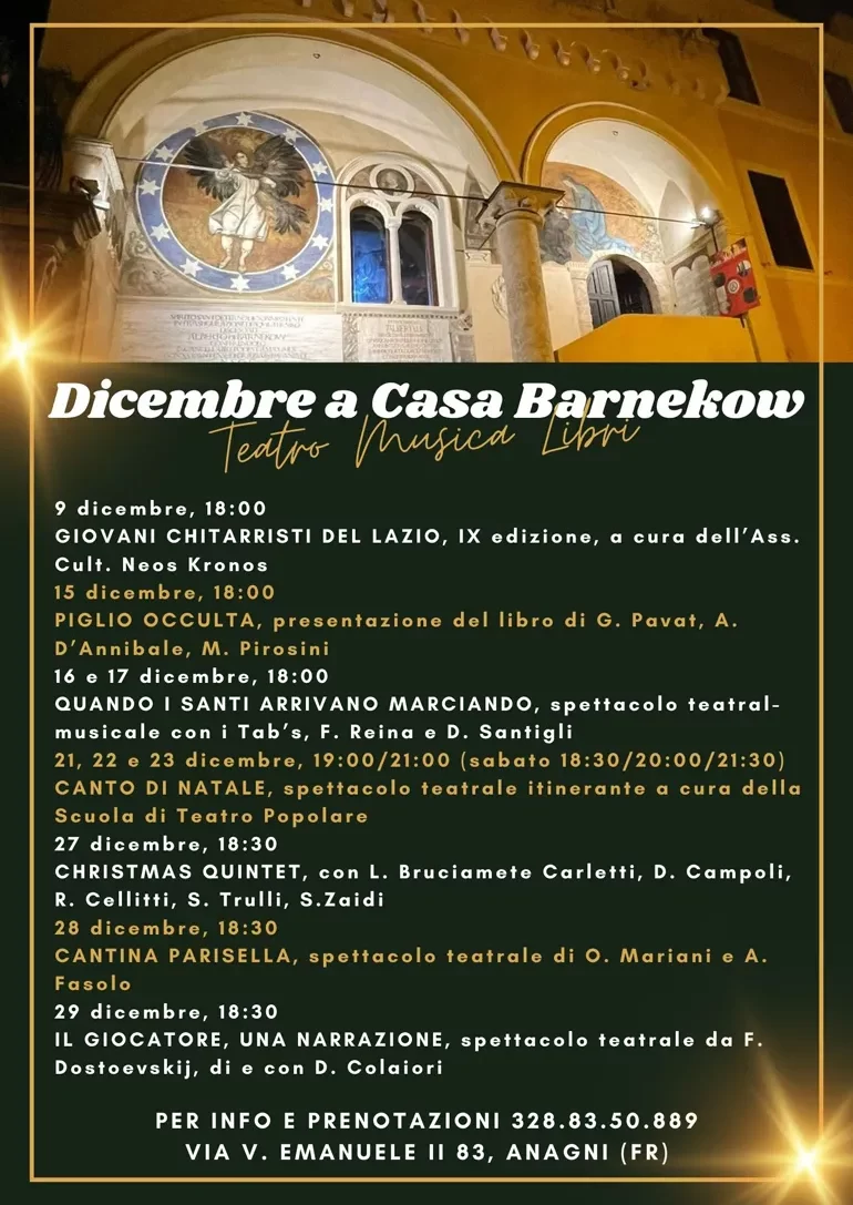 ANAGNI (Eledina Lorenzon) – Sono tanti gli appuntamenti natalizi in calendario che dal 9 al 29 Dicembre si svolgeranno nella splendida dimora storica Casa Barnekow, ad Anagni e che spazieranno dal teatro alla musica ed ai libri, sempre con un’attenzione particolare verso il territorio del Lazio Meridionale con la volontà di costruire sempre più un luogo d’incontro e di scambio su temi legati all’Arte, alla Cultura e alla Storia.