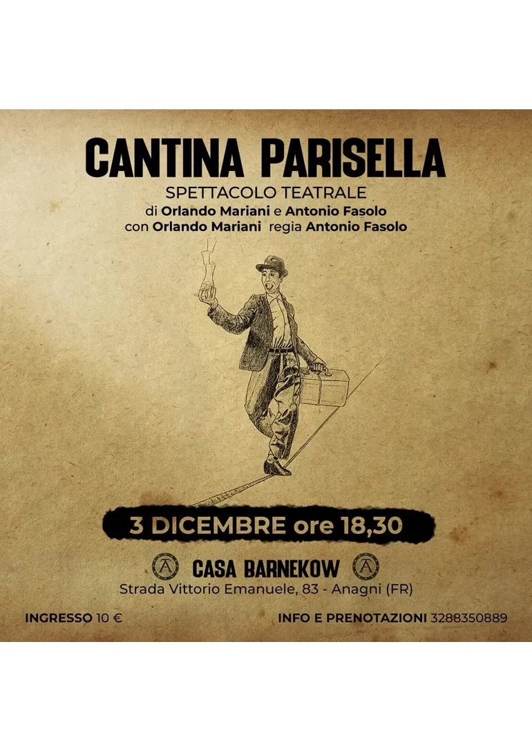 Giovedì 28 Dicembre, ore 18:30, è la volta di “Cantina Parisella”, di Orlando Mariani e Antonio Fasolo, con Orlando Mariani: costellazioni piscologiche e alberi genealogici, eventi storici e ricordi intimi, archetipi e giocattoli, vecchi film e vecchie canzoni… Questi gli elementi di “Cantina Parisella” che non è uno spettacolo, ma è un racconto, una memoria, un’indagine, una confessione. Un ritratto di famiglia in un interno, citando Luchino Visconti. Anzi, di due famiglie le cui storie corrono su due binari paralleli che distano l’uno dall’altro la larghezza di un vicolo di Terracina.