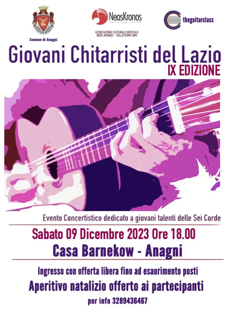 Si inizia Sabato 9 Dicembre alle ore 18 con la rassegna “Giovani Chitarristi del Lazio – IX edizione” che abbiamo il piacere di ospitare per il terzo anno consecutivo: un evento concertistico di giovanissimi e talentuosi musicisti a cura dell’Associazione Culturale Musicale Neos Kronos e sotto la direzione del Maestro Stefano Spallotta. L’evento si concluderà con un aperitivo natalizio.