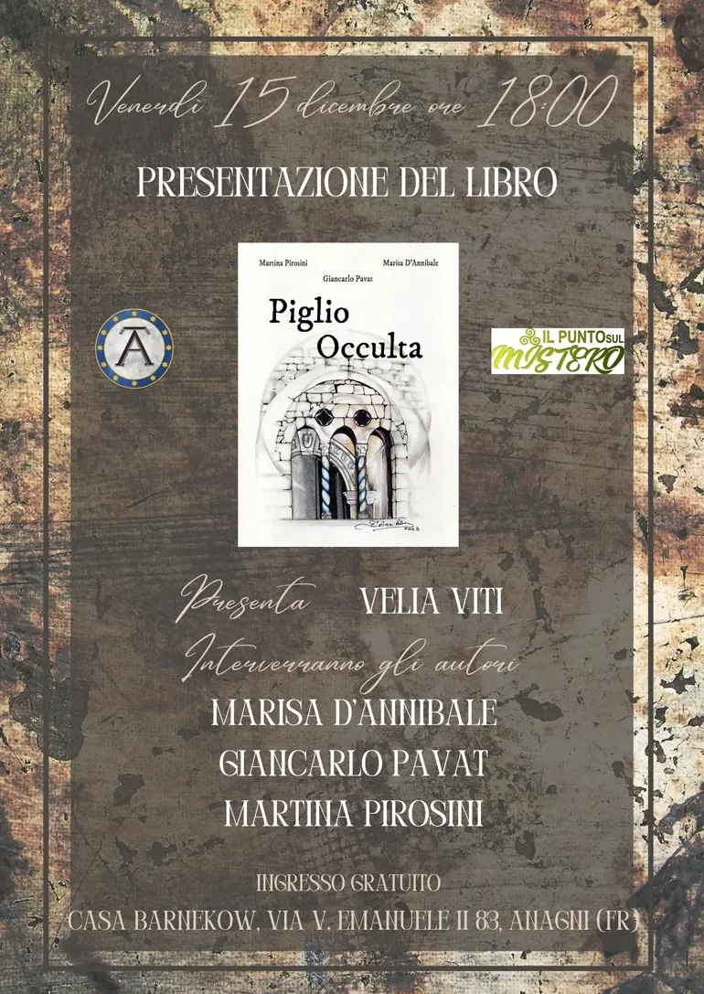 Venerdì 15 Dicembre, alle ore 18, in collaborazione con il sito “Il Punto Sul Mistero”, viene presentato “Piglio Occulta”, un libro dedicato a questa piccola, ma interessantissima città ciociara, più celebre per il suo Cesanese, che è il risultato di una lunga e approfondita ricerca storica che ha come scopo quello di dare il meritato valore culturale a questo antico centro. Interverranno i tre autori, Giancarlo Pavat, Marisa D’Annibale e Martina Pirosini.