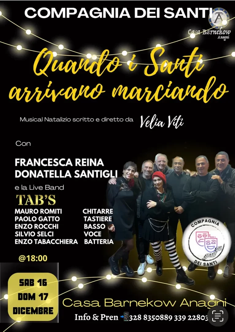 Sabato 16 e Domenica 17 Dicembre, alle 18, torna l’originale commedia-concerto “Quando i Santi arrivano marciando”, scritta e diretta da Velia Viti, che vede in scena l’attrice Francesca Reina, la cantante Donatella Santigli e il gruppo dei Tab’s (Mauro Romiti, Enzo Tabacchiera, Enzo Rocchi, Paolo Gatto, Silvio Selci):