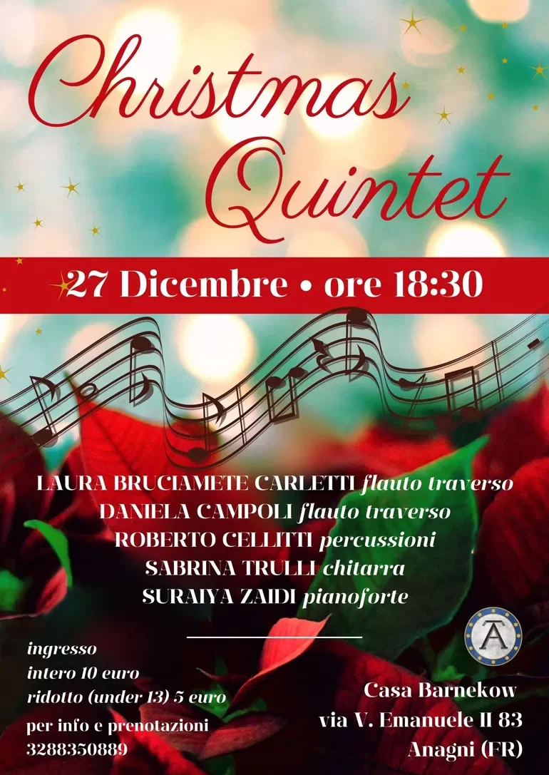 Mercoledì 27 Dicembre alle ore 18.30 è in programma il bellissimo concerto del “Christmas Quintet” (Laura Bruciamete Carletti, Daniela Campoli, Roberto Cellitti, Sabrina Trulli, Suraiya Zaidi), interamente dedicato alle più famose canzoni natalizie, con arrangiamenti originali.