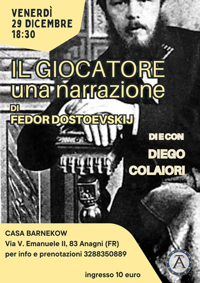 Venerdì 29 Dicembre alle 18.30 si chiude in bellezza con uno dei più grandi autori i tutti i tempi: Fedor Dostoevskij. Con questo “Padre” assoluto della letteratura mondiale si confronta un giovane e audace Diego Colaiori, autore e attore, in uno “story-telling” con musica, letture interpretate e commenti, che mira a raccontare la nascita del romanzo del genio russo e giocatore d’azzardo: la necessità della scrittura, i sogni di giovinezza, l’amore e la Dea Fortuna si incontreranno in questo racconto sullo sfondo di una Russia già al tempo distante dall’Europa; una distanza con sostanziali differenze.