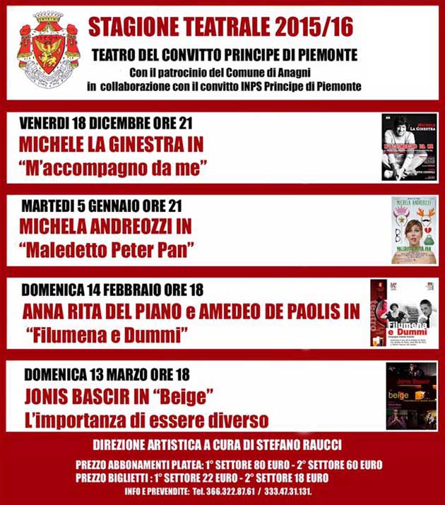 ANAGNI (FR) – Avrà inizio Venerdi 18 Dicembre (inizio spettacolo alle 21,00) la stagione teatrale voluta e patrocinata dal comune di Anagni in collaborazione con il Teatro del Convitto Inps Principe di Piemonte, che ospiterà l’intera rassegna in cartellone.