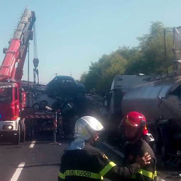 Intorno alle ore 12,15 di oggi, 12 Ottobre, all’altezza del Km 661,200 una drammatica carambola ha visto coinvolti in un groviglio di lamiere una bisarca (autocarri per il trasporto di vetture), un’autocisterna e tre autovetture.