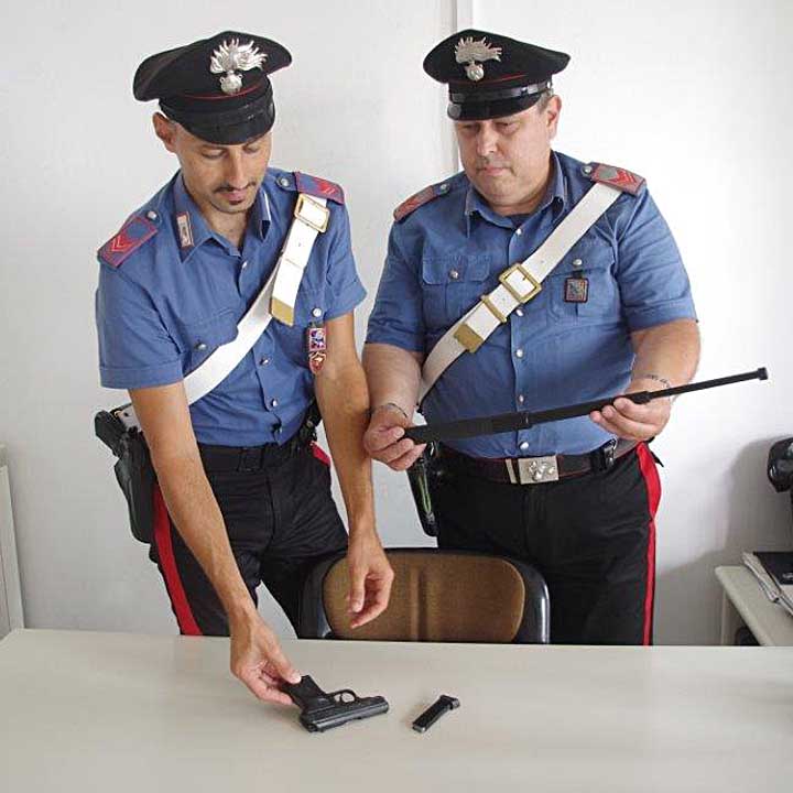 Ma il fratello della vittima ha deciso di reagire chiamando i Carabinieri, che sono intervenuti in forze ed hanno liberato l’imbianchino, arrestando i due aguzzini e sequestrando – oltre alla pistola scacciacani – anche uno sfollagente telescopico, anch’esso utilizzato per le minacce.