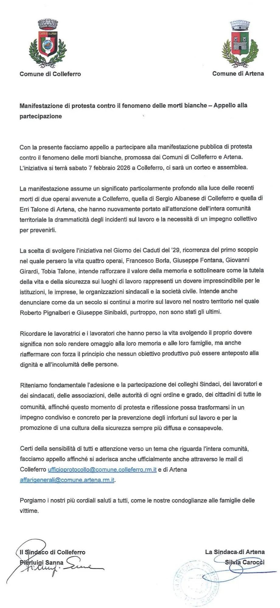 I COMUNI DI COLLEFERRO E ARTENA, con i rispettivi Sindaci Pierluigi Sanna e Silvia Carocci, lanciano un appello congiunto alla cittadinanza, alle istituzioni, alle associazioni e alle organizzazioni sindacali per partecipare alla manifestazione pubblica di protesta contro il fenomeno delle morti bianche, in programma a Colleferro Sabato 7 Febbraio 2026.