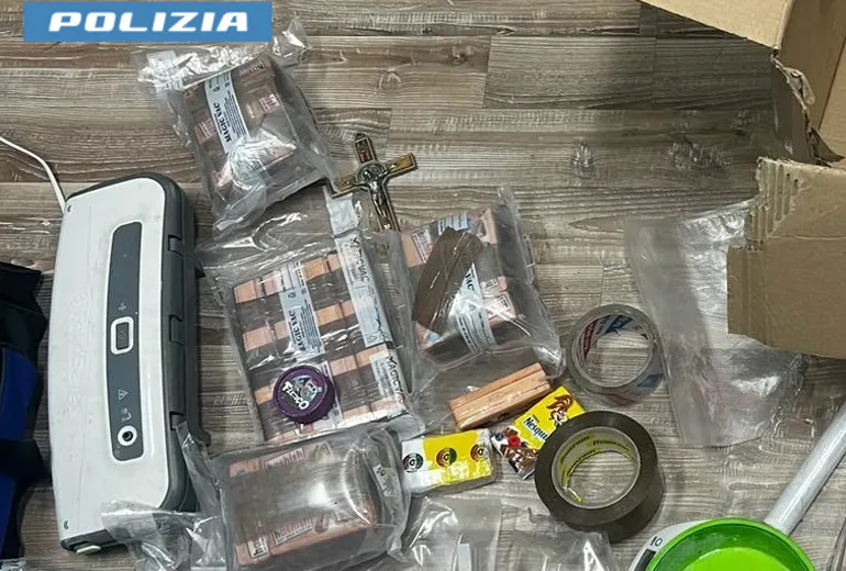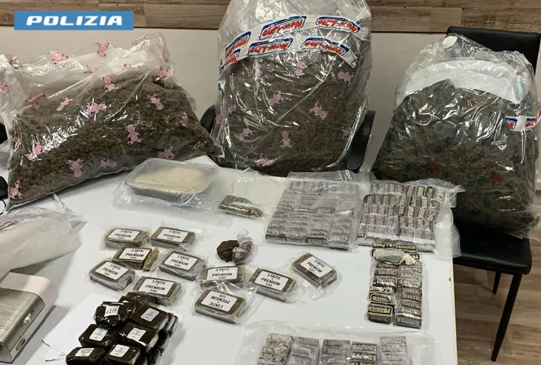 All’interno della stessa sono stati rinvenuti 87 Kg di hashish, 740 grammi di cocaina rosa, circa 8 grammi di cocaina bianca. oltre a materiale per il confezionamento.