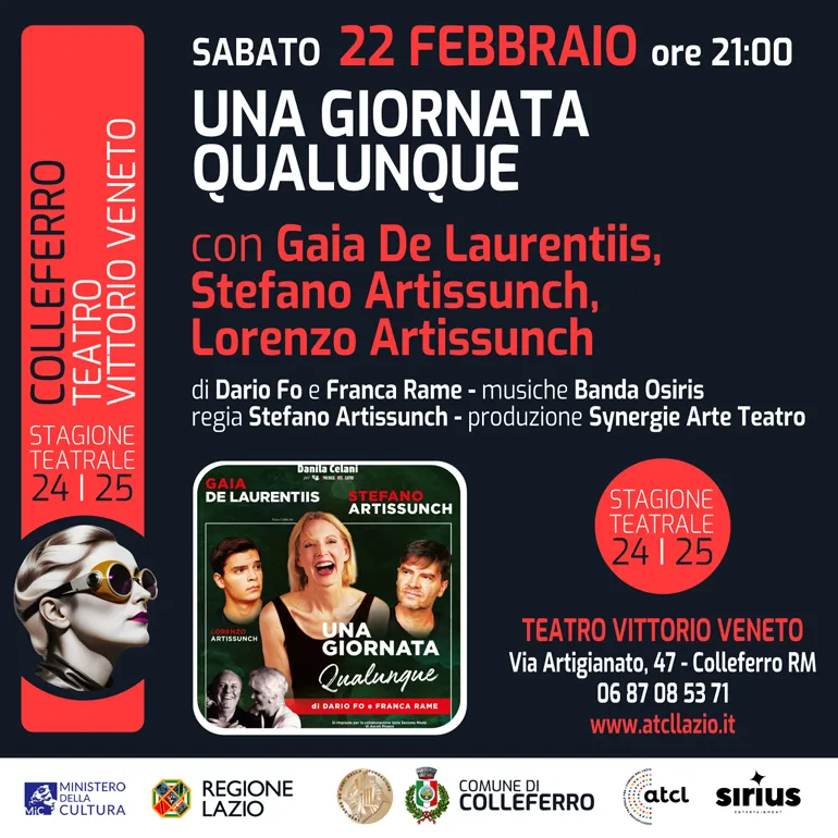 COLLEFERRO – Sabato 22 Febbraio alle ore 21 va in scena – al Teatro comunale Vittorio Veneto di Colleferro – la pièce “Una giornata qualunque” di Dario Fo e Franca Rame con Gaia De Laurentiis e Lorenzo e Stefano Artissunch che cura anche la regia dello spettacolo.