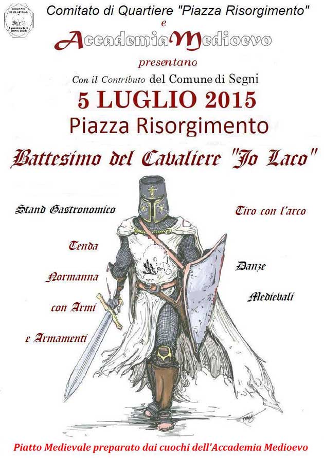 SEGNI (RM) – “Battesimo del Cavaliere” Domenica 5 Luglio in Piazza Risorgimento, a partire dalle ore 19: Torneo di tiro con l’arco, Danze medievali in cerchio, Allestimento con Tenda Normanna con Armi e Armamenti con il gruppo storico “Accademia Medioevo”, www.accademiamedioevo.it, nella presentazione del Cavaliere alla Contrada “Jo Laco” in vista del Palio di San Bruno che si correrà il 19 Luglio, e ovviamente il “vero” piatto medievale frutto di ricerca storica e stand gastronomici. Un tuffo nel passato, precisamente nel medioevo, in quella parte di storia in cui l’abilità della spada, il combattimento, la bravura nel destreggiarsi con il cavallo nei mille pericoli del vivere quotidiano, la tecnica nei duelli, ma anche la mitologia, la magia che popola il secolo rivive in questa estiva domenica pomeriggio.