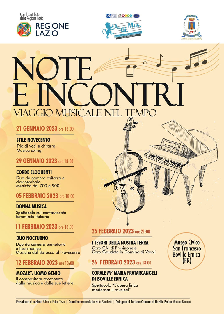 La rassegna dal titolo “Note e incontri, viaggio musicale nel tempo” realizzata grazie all’Associazione Agimus, con il contributo della Regione Lazio e il patrocinio del Comune di Boville Ernica, impegnato in prima linea con il Sindaco Enzo Perciballi e la Consigliera delegata al Turismo Martina Bocconi.