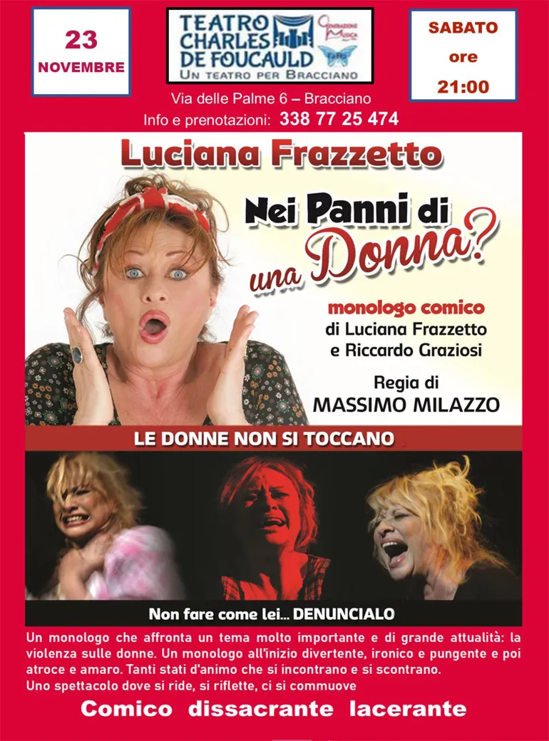 BRACCIANO (Luciana Vinci) – Sabato 23 Novembre alle ore 21 al Teatro Charles de Foucauld di Bracciano andrà in scena “Nei panni di una donna” monologo di e con Luciana Frazzetto. Regia di Massimo Milazzo.