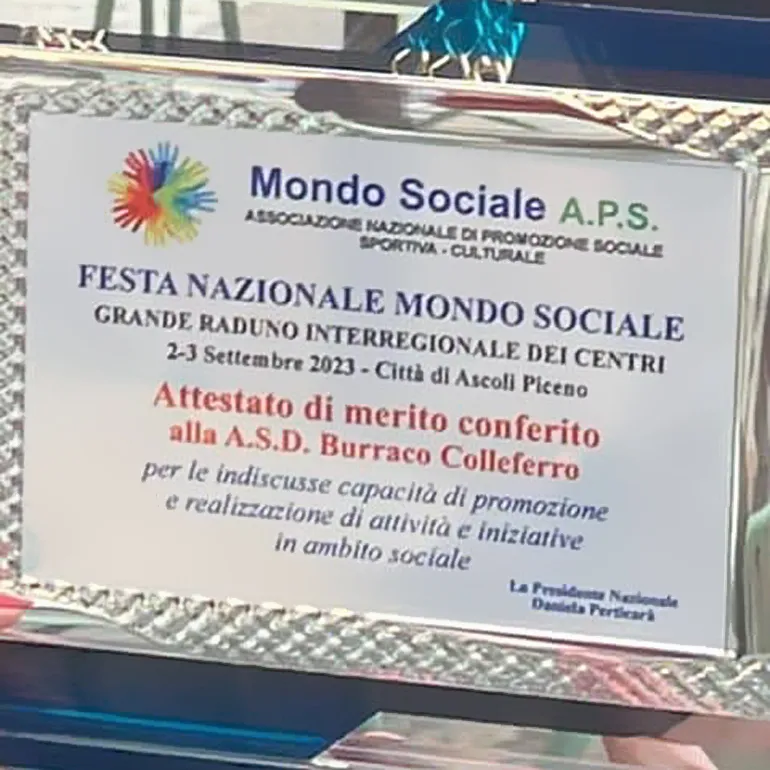 L’Asd Burraco Colleferro, già nota per le molteplici attività sociali e per la collaborazione con i gruppi di volontariato locale, ha ricevuto ad Ascoli Piceno un attestato di merito per le indiscusse capacità di promozione e realizzazione di attività ed iniziative in ambito sociale durante lo svolgimento della Festa Nazionale Mondo Sociale (Associazione Nazionale di Promozione Sociale Sportiva – Culturale).