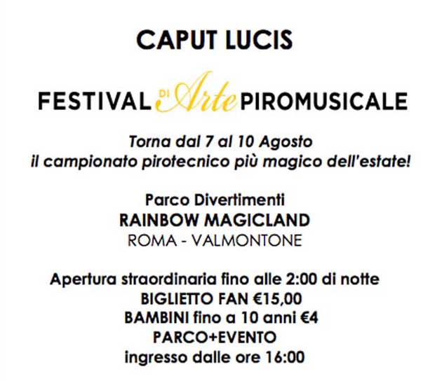 La Giuria di Qualità, composta da Rappresentanti Istituzionali, del Ministero dell’Interno e della Difesa, Presidenti delle Associazioni Patrocinanti, Pirotecnici affermati, Stampa, valuterà gli spettacoli e decreterà il Vincitore del Trofeo Caput Lucis 2015 nella serata finale.L’undicesima edizione di Caput Lucis, sarà una fantastica occasione di divertimento per tutti, famiglie e giovani che, oltre ai fuochi d’artificio, potranno godersi la variegata offerta di divertimento del parco Rainbow MagicLand, con tutte le attrazioni aperte come Mistyca, Huntik 5D, Shock e spettacoli come Romeo e Giulietta, La Leggenda dei Cavalieri o incontrare le Winx. Solo per l’evento Caput Lucis, infatti, è previsto il BIGLIETTO FAN di €15 e per i bambini fino a 10 anni di €4 per l’ingresso al Parco dalle ore 16.00 e comprende tutte le attrazioni e gli spettacoli, gli intrattenimenti e la visione della gara pirotecnica.
