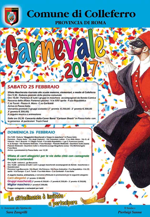 COLLEFERRO (RM) – Le manifestazioni organizzate dall’Assessorato allo Spettacolo del Comune di Colleferro, in occasione del “Carnevale Colleferro 2017”, si concentrano nel prossimo weekend (Sabato 25 e Domenica 26 Febbraio), molto denso di eventi ed iniziative.