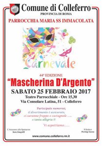 Sempre Sabato, a partire dalle ore 15,30, presso il Teatro della Parrocchia dell’Immacolata, andrà in scena la 44a Edizione della “Mascherina d’Argento”, una delle più antiche e tradizionali manifestazioni carnascialesche di Colleferro