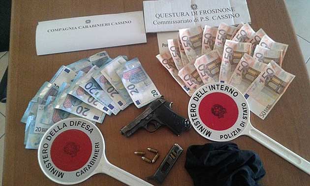 Addosso al malvivente, immediatamente bloccato, vengono trovati una pistola 765, con colpo in canna e caricatore inserito, un passamontagna di colore nero e la refurtiva consistente in denaro contante per euro 1.200.