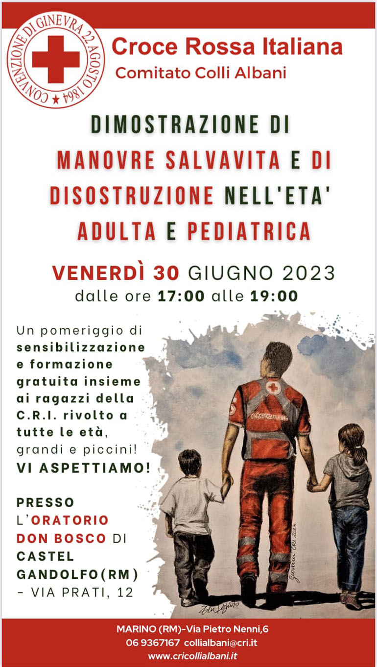 CASTEL GANDOLFO – Venerdì 30 Giugno presso l’Oratorio Salesiano di Castelgandolfo – sito in Via Prati 12 – dalle ore 17 alle ore 19, la Croce Rossa Italiana-Comitato Colli Albani, terrà una “Dimostrazione di manovre salvavita e di disostruzione nell’età adulta e pediatrica”.