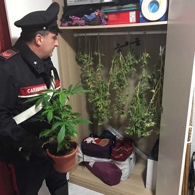 Infatti, oltre a ventuno piante di marijuana per un peso complessivo di circa 700 grammi, i militari hanno rinvenuto due serre artigianali complete di lampade fluorescenti per favorire la crescita delle piante.