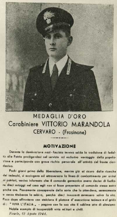 Nel corso della cerimonia è stata ampiamente ricordata la motivazione della medaglia d’Oro al Valor Militare alla memoria concessa al Carabiniere Vittorio Marandola, che così recita: