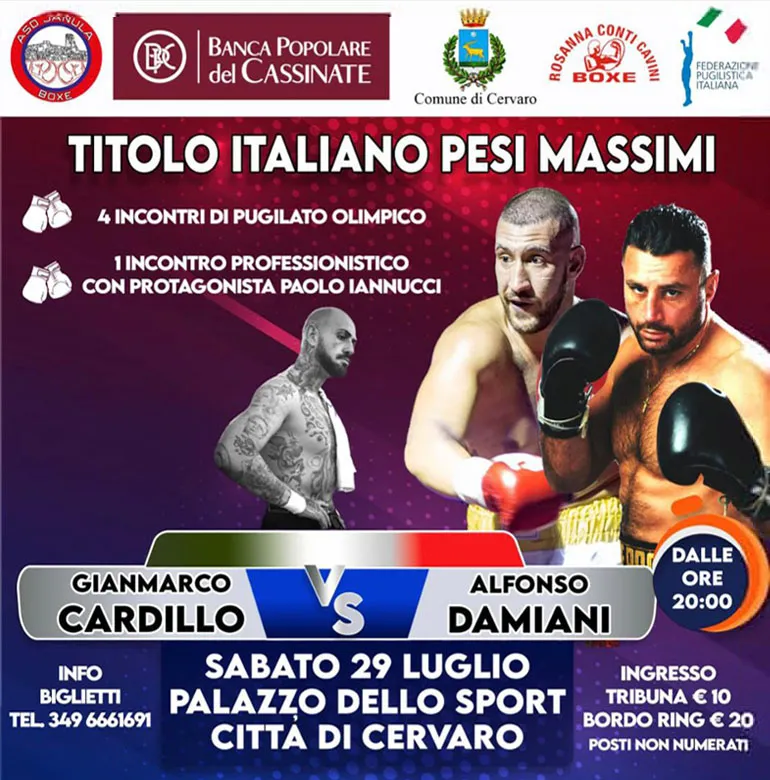 L’evento organizzato dalla “Rossana Conti Cavini Boxe” (organizzatrice di eventi pugilistici nazionali e internazionali da oltre 40 anni) e dalla Federazione Pugilistica Italiana, vedrà sul ring due grandi campioni Gianmarco Cardillo (della Marsicana Boxe – 10v2s) e Paolo Alfonso Damiani (della Lazio Nuova Pugilato – 7v4s) che è stato chiamato a causa dell’indisponibilità Emanuele Venturelli, per il suo attuale posizionamento in classifica e per le ottime prestazioni messe in atto in Germania a Wuppertal lo scorso 1 Luglio contro il campione cubano Castillo Rodriguez.