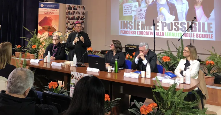 «Sono contento ed emozionato – ha detto il Procuratore di Velletri, Giancarlo Amato – di essere davanti a questi studenti, che rappresentano la maggioranza dei nostri ragazzi, una maggioranza portatrice di valori veri, valori reali, valori di legalità, di rispetto delle regole. Procura e Diocesi sono due istituzioni differenti, una laica e una religiosa, che hanno deciso di continuare a collaborare sulla base di un atto formale, di unire le forze verso un obiettivo che le accomuna: il tentativo di venire incontro alle esigenze dei territori e di difendere i più deboli, i più indifesi, i più vulnerabili.
