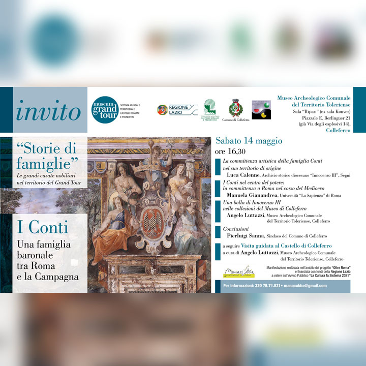 Sabato 14 maggio ore 16.30 – “Storie di Famiglie” – Le grandi casate nobiliari del territorio del Grand Tour, presso il Museo Archeologico Comunale del Territorio Toleriense che sarà seguita da una visita guidata al Castello di Colleferro.