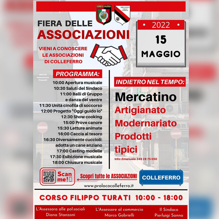 Domenica 15 Maggio, la Pro Loco Città di Colleferro, con il patrocinio del Comune di Colleferro, organizza una fiera delle associazioni in Corso Turati dalle ore 10 alle 18. Nel Corso Turati si terrà il Mercatino dell’Artigianato, del Modernariato e dei Prodotti Tipici.