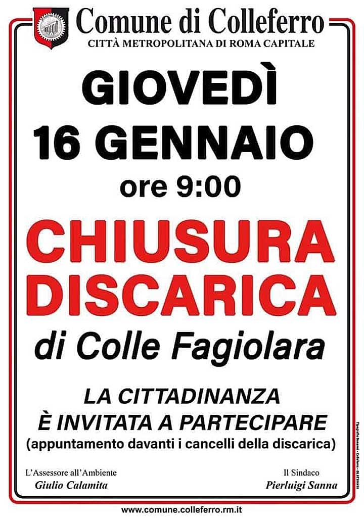 Colleferro. 16 Gennaio 2020 ore 9. Chiude la Discarica di Colle Fagiolara. L’Amministrazione Comunale invita la cittadinanza a partecipare all’evento