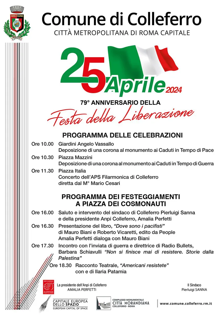 Nel pomeriggio, a partire dalle ore 15.30 presso Piazza Italia, avranno luogo i festeggiamenti a cura dell’Anpi Colleferro.
