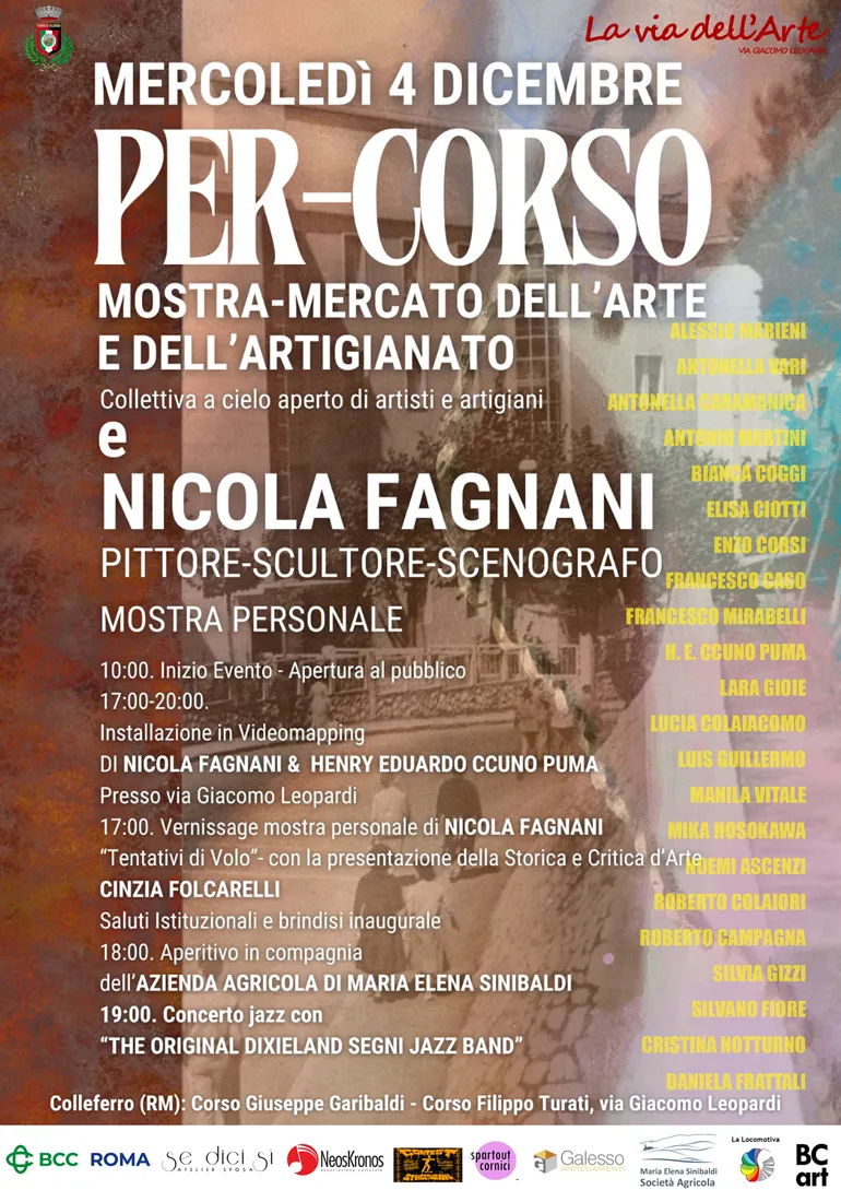COLLEFERRO – Mercoledì 4 Dicembre, a Colleferro, in occasione della festa patronale dedicata a Santa Barbara e delle iniziative per il festeggiamento del novantesimo anno dalla nascita della città, l’Associazione di Promozione Sociale “La Via dell’Arte” di Colleferro, ha organizzato un vero e proprio percorso artistico, partendo da piazza Italia arriverà sino a Largo Boccaccio, passando da Via Giacomo Leopardi, ormai nota come, appunto, la Via dell’Arte.