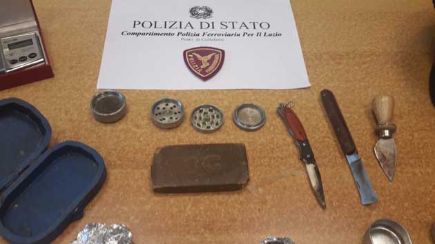 Trovato in possesso di circa 150 grammi di hashish a bordo di un convoglio ferroviario proveniente da Roma e diretto a Cassino.